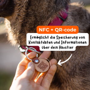 PetIdentity ist ein innovativer Chip mit den Maßen 4 x 3,5 cm, vergleichbar mit einer gravierten Hundemarke. Der Chip besteht aus Holz und ist mit hochwertigem Epoxidharz beschichtet, was ihn vollständig vor äußeren Einflüssen schützt, egal wo sich dein Hund befindet. Zusätzlich zum physischen Chip enthält er einen NFC-Chip und auf der Rückseite einen QR-Code. Dies ermöglicht es, den Chip dauerhaft durch einfaches Halten an ein Handy oder durch Scannen des QR-Codes mit der Kamera zu lesen.