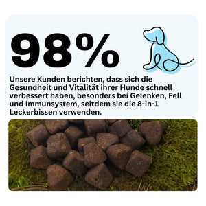 Seit ich die ‚8 in 1‘-Leckerlis verwende, hat sich das Wohlbefinden meines Hundes dramatisch verbessert. Sein Fell glänzt, und er ist aktiver und gesünder. Ich kann diese Leckerlis nur empfehlen!