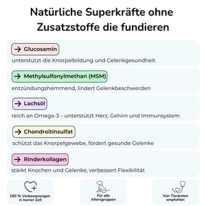 Die Hauptinhaltsstoffe sind Glucosamin, Salmon Oil, MSM, Chondroitin, und eine Vitaminmischung, die zusammen eine breite Palette von gesundheitlichen Vorteilen bieten.